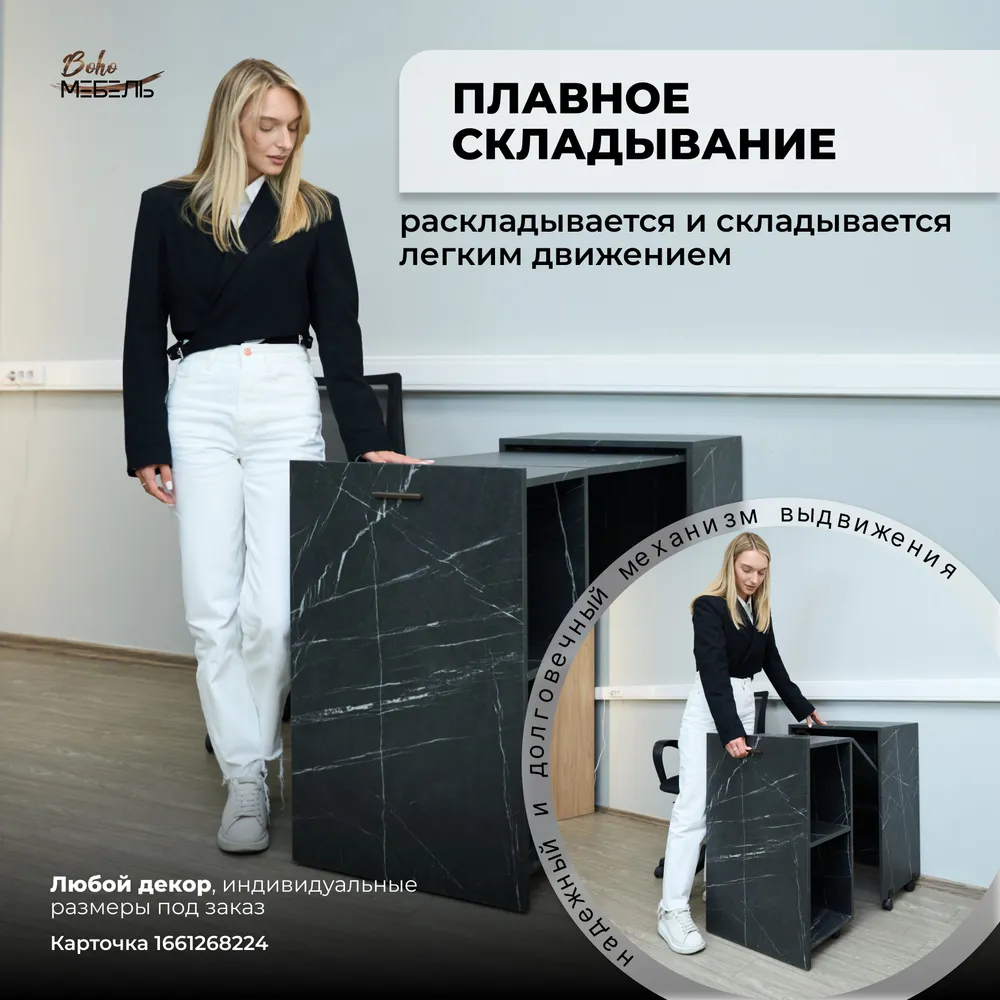Особенности: Дополнительная полка для аксессуаров, С полками, С ящиками, Складывание в стопку, С тумбой, Конференц-столик